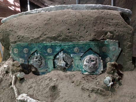 The four-wheeled vehicle made of wood and iron with decorations in bronze and tin was almost perfectly preserved when the city was buried by the volcanic eruption of Mount Vesuvius in AD79.