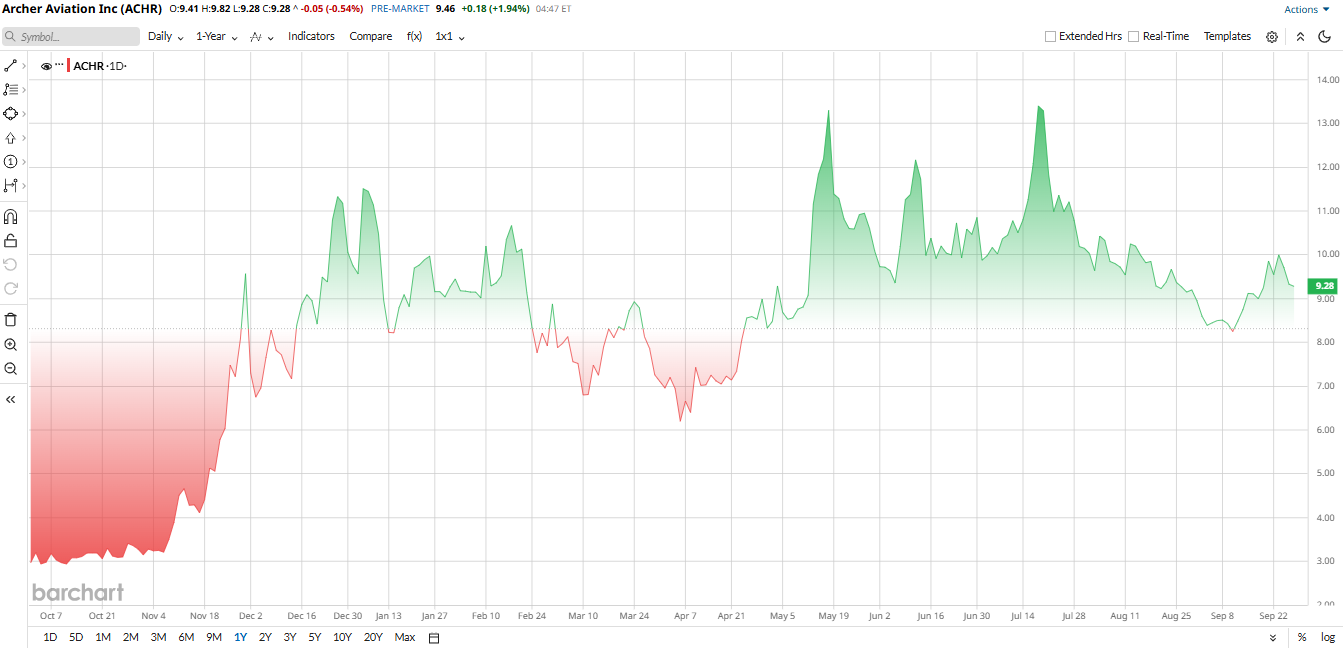 Archer’s stock has been volatile this year. After a strong rally in early 2025, fueled by milestones like signing on as the official air taxi provider for the LA 2028 Olympics and advancing its UAE program, the shares hit a 52-week high near $13.92 in the spring. As of late September, ACHR traded around $9, down about 30% from its high, reflecting some profit-taking and broader market pressure. However, year-to-date (YTD), the stock is down nearly 4%.