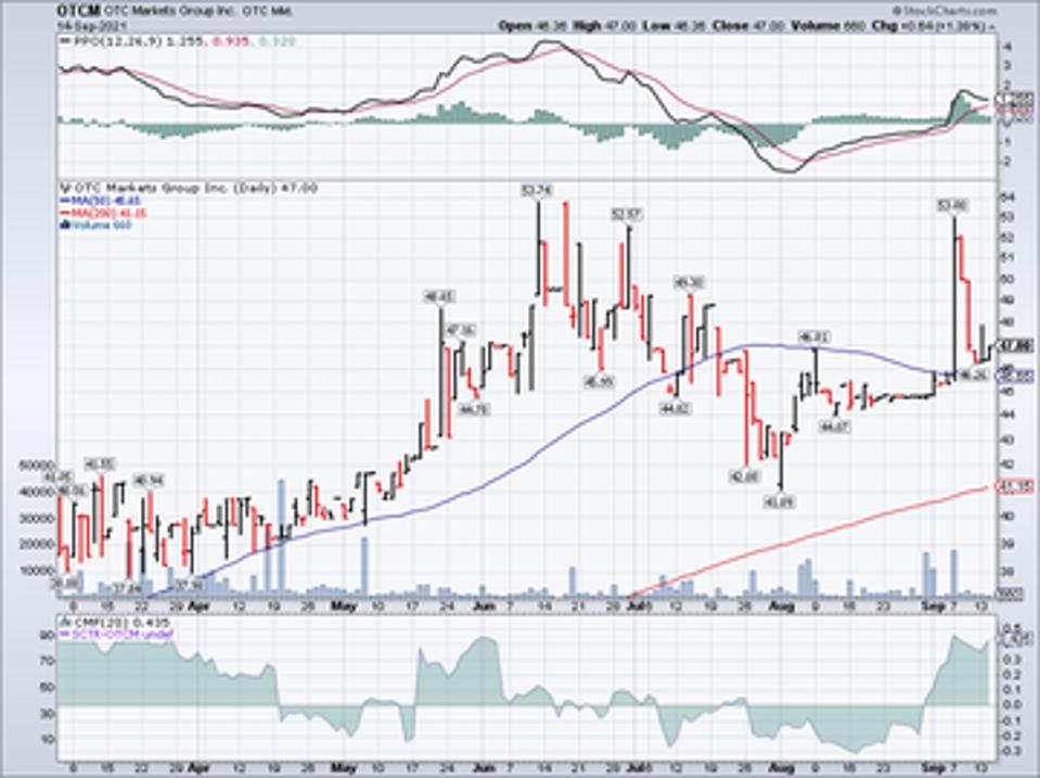 Otc Markets Group is our final Top Buy today. This is the type of stock for penny stock and microcap investors. OTC Markets Group is an American financial market providing price and liquidity information for almost 10,000 over-the-counter securities. OTC-traded securities are organized into three markets based on opportunities and risks: OTCQX, OTCQB, and Pink. Our AI systems rated Otc Markets Group C in Growth, C in Low Volatility Momentum, and A in Quality Value. The stock closed up 1.38% to $47.0 on volume of 704 vs its 10-day price average of $47.03 and its 22-day price average of $45.94, and is up 34.29% for the year. Revenue grew by 19.51% in the last fiscal year and grew by 38.44% over the last three fiscal years, Operating Income grew by 38.64% in the last fiscal year and grew by 51.26% over the last three fiscal years, and EPS grew by 31.3% in the last fiscal year and grew by 47.76% over the last three fiscal years. Revenue was $65.4M in the last fiscal year compared to $56.46M three years ago, Operating Income was $21.43M in the last fiscal year compared to $19.64M three years ago, EPS was $1.53 in the last fiscal year compared to $1.36 three years ago, and ROE was 98.2% in the last year compared to 107.53% three years ago. The stock is also trading with a Forward 12M P/E of 24.1.