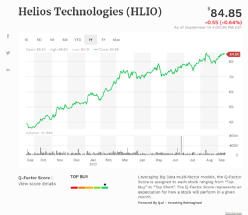 Helios Technologies is our next Top Buy. Helios Technologies is a global leader in highly engineered motion control and electronic controls technology for industries such as construction, material handling, agriculture, energy, recreational vehicles, marine, health and wellness. Our AI systems rated the company C in Technicals, B in Growth, A in Low Volatility Momentum, and A in Quality Value. The stock closed down 0.64% to $84.85 on volume of 102,274 vs its 10-day price average of $84.1 and its 22-day price average of $82.3, and is up 63.42% for the year. Revenue grew by 34.31% in the last fiscal year and grew by 38.28% over the last three fiscal years, Operating Income grew by 48.64% in the last fiscal year and grew by 45.67% over the last three fiscal years, and EPS grew by 403.97% in the last fiscal year and grew by 49.61% over the last three fiscal years. Revenue was $523.04M in the last fiscal year compared to $508.04M three years ago, Operating Income was $78.4M in the last fiscal year compared to $80.0M three years ago, EPS was $0.44 in the last fiscal year compared to $1.49 three years ago, and ROE was 2.4% in the last year compared to 11.63% three years ago. Forward 12M Revenue is expected to grow by 4.5% over the next 12 months, and the stock is trading with a Forward 12M P/E of 22.14.