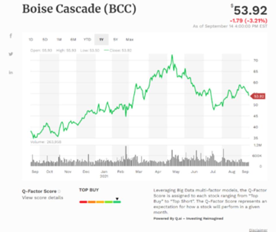 Boise Cascade Co is our second Top Buy today. Boise Cascade manufactures wood products and is also a wholesale distributor of building materials. With inflation causing the price of building materials to skyrocket, Boise Cade is a company to keep a close eye on. Our AI systems rated the company B in Technicals, A in Growth, B in Low Volatility Momentum, and A in Quality Value. The stock closed down 3.21% to $53.92 on volume of 265,941 vs its 10-day price average of $56.68 and its 22-day price average of $56.02, and is up 12.83% for the year. Revenue grew by 33.81% in the last fiscal year and grew by 46.66% over the last three fiscal years, Operating Income grew by 151.52% in the last fiscal year and grew by 523.38% over the last three fiscal years, and EPS grew by 230.92% in the last fiscal year and grew by 2725.56% over the last three fiscal years. Revenue was $5474.84M in the last fiscal year compared to $4995.29M three years ago, Operating Income was $344.28M in the last fiscal year compared to $138.91M three years ago, EPS was $4.44 in the last fiscal year compared to $0.52 three years ago, and ROE was 22.55% in the last year compared to 3.04% three years ago. The stock is also trading with a Forward 12M P/E of 8.17.