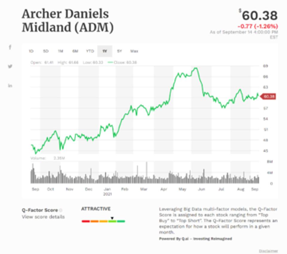 Food processing giant Archer-Daniels-Midland is our first Top Buy. The company operates more than 270 plants and 420 crop procurement facilities worldwide and also provides agricultural storage and transportation services. Our AI systems rated Archer-Daniels-Midland B in Technicals, B in Growth, and B in Low Volatility Momentum, and C in Quality Value. The stock closed down 1.26% to $60.38 on volume of 2,354,740 vs its 10-day price average of $60.04 and its 22-day price average of $60.26, and is up 21.07% for the year. Revenue grew by 16.42% in the last fiscal year and grew by 16.45% over the last three fiscal years, Operating Income grew by 46.95% in the last fiscal year and grew by 37.94% over the last three fiscal years, and EPS grew by 30.21% in the last fiscal year and grew by 28.57% over the last three fiscal years. Revenue was $64355.0M in the last fiscal year compared to $64341.0M three years ago, Operating Income was $1806.0M in the last fiscal year compared to $1924.0M three years ago, EPS was $3.15 in the last fiscal year compared to $3.19 three years ago, and ROE was 9.05% in the last year compared to 9.7% three years ago. The stock is also trading with a Forward 12M P/E of 13.99.
