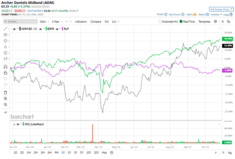 ADM has soared 12.1% over the past 52 weeks, underperforming the S&P 500 Index’s ($SPX) 16.9% gains. However, the stock has outpaced the Consumer Staples Select Sector SPDR Fund’s (XLP) 3.2% dip during the same time frame.
