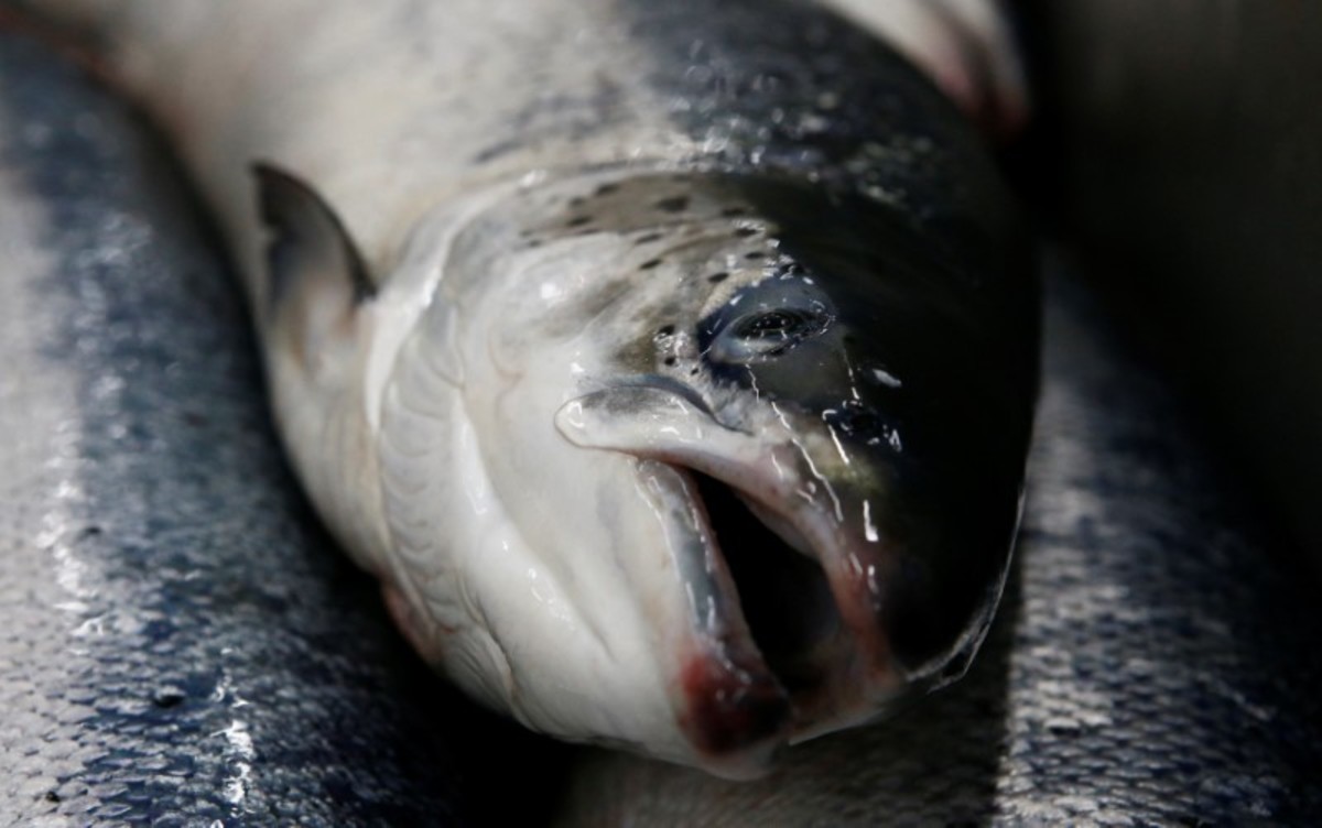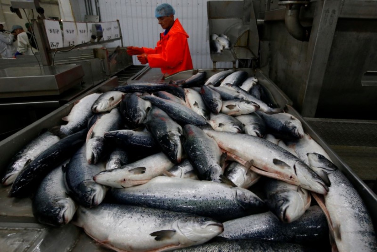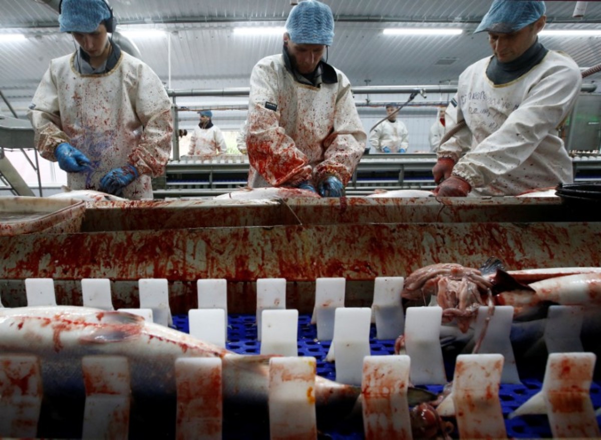 When they mature, the fish are loaded onto special ships and, still alive, are brought to a Murmansk factory for processing.