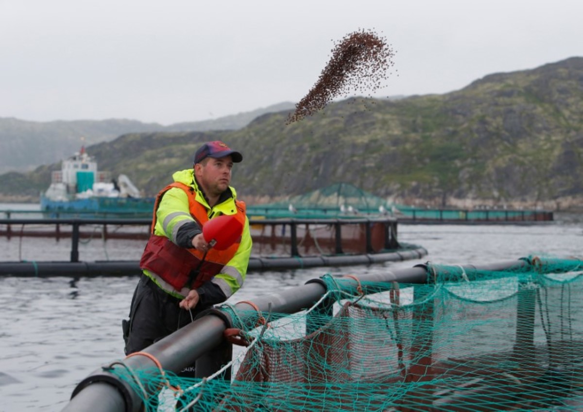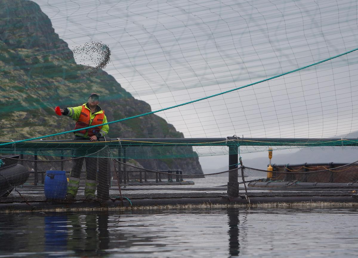 Thousands of adult trout and salmon swarm inside the open-sea cages as workers toss in generous portions of high-calorie feed.