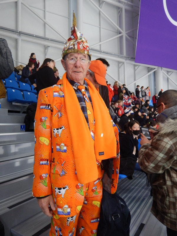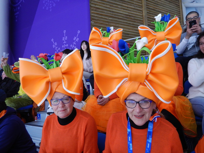 Orange was the dominant theme for Dutch fans' outfits as they watched the men's 5,000 meters at the Gangneung Oval on Sunday. Souja Vervaet, who came from the city of Hulst in the Netherlands, cheered the skaters alongside three of her friends, all of whom were wearing hand-made tulip-motif hats.