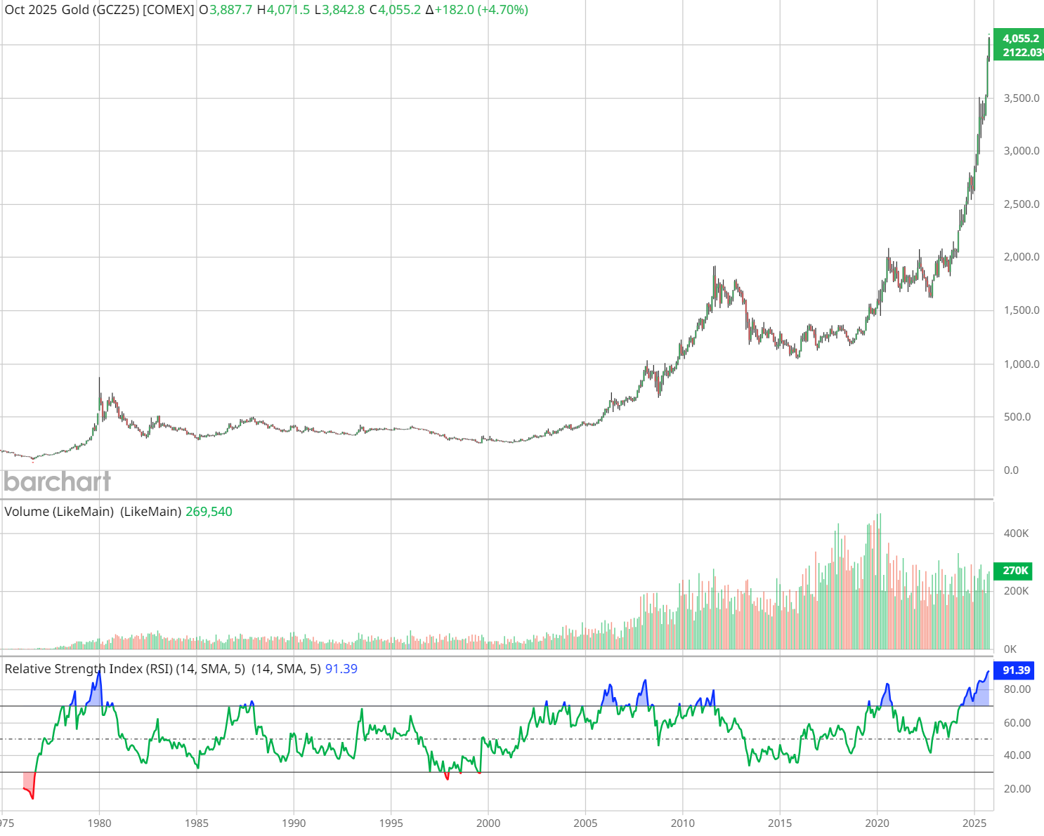 In the latest Market on Close livestream, co-hosts John Rowland, CMT, and “Twitter Tom” tackled a shocking chart milestone: Gold’s monthly Relative Strength Index (RSI) just rose above 90 — signaling the most overbought conditions since 1980.