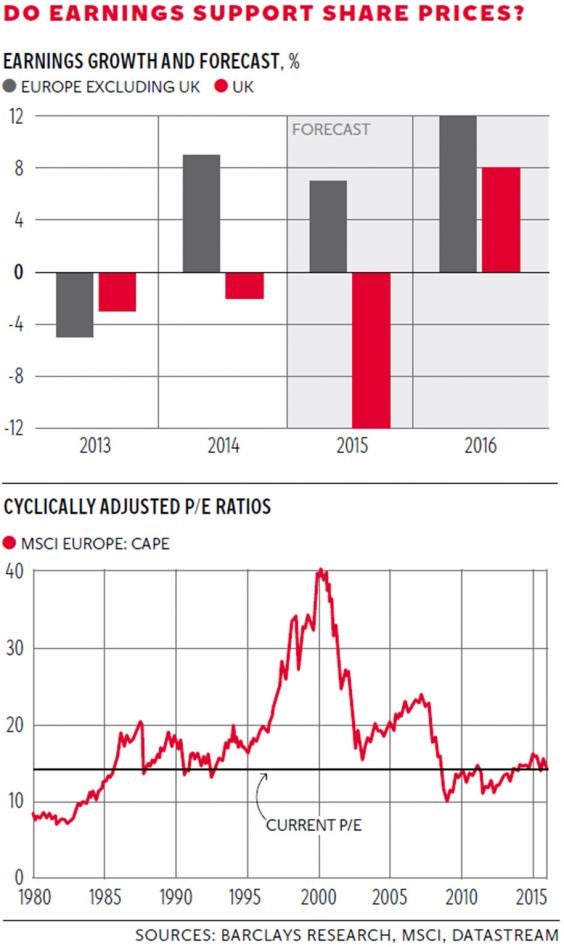 Well let’s start with earnings: if there are earnings that will either be paid out in dividends or eventually be reflected in the share price. The top graph, taken from some work on equity valuations by Barclays, shows the recent record of European and UK earnings plus some projections for last year and this – we haven’t really got into the reporting season yet, with things starting to pick up next week. As you can see, the UK story is not a pretty one, for we are skewed by the heavy weighting in banking, energy and resources. But the 2016 estimate is at least positive, which makes a change. European companies, by contrast, have both a better performance and a better outlook.