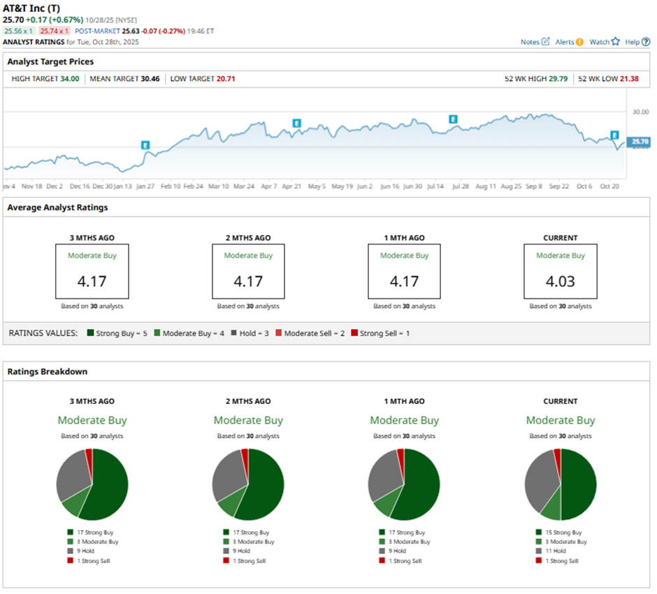 The mean price target of $30.46 represents a premium of 18.5% to AT&T's current price. The Street-high price target of $34 suggests a 32.3% potential upside.