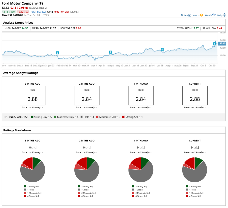 Among the 25 analysts covering F stock, the consensus is a “Hold.” That’s based on three “Strong Buy” ratings, 17 “Holds,” one “Moderate Sell,” and four “Strong Sells.”