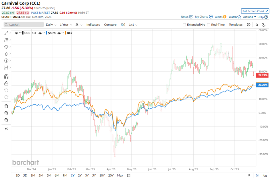 Shares of the Miami, Florida-based company have outperformed the broader market over the past 52 weeks. CCL stock has gained 27.1% over this time frame, while the broader S&P 500 Index ($SPX) has increased 18.3%. However, shares of the company are up 11.8% on a YTD basis, lagging behind SPX’s 17.2% rise.