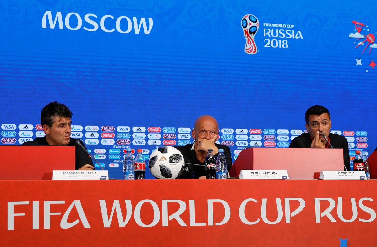 Soccer Football - World Cup - Referees News Conference - Moscow, Russia - June 12, 2018. (L-R) FIFA Refereeing Director Massimo Busacca, FIFA Chairman of Referees Committee Pierluigi Collina and referee Sandro Ricci attend a news conference. REUTERS/Tatyana Makeyeva