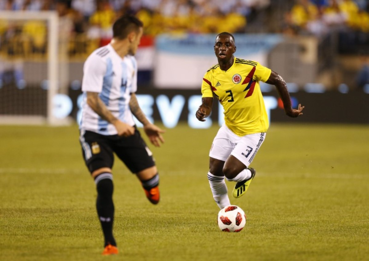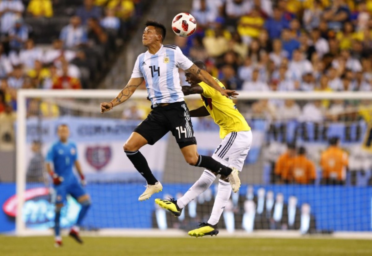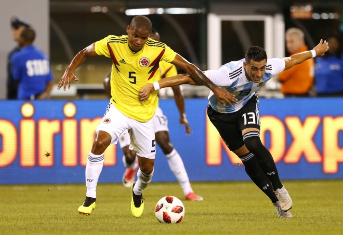 Sep 11, 2018; East Rutherford, NJ, USA; Colombia defender Óscar Murillo (3) plays the ball against Argentina defender Cristian Ansaldi (4) during first half of an international friendly soccer match at MetLife Stadium. Mandatory Credit: Noah K. Murray-USA TODAY SportsSep 11, 2018; East Rutherford, NJ, USA; Colombia midfielder Wilmar Barrios (5) and Argentina midfielder Maximiliano Meza (13) battle for the ball during first half of an international friendly soccer match at MetLife Stadium. Mandatory Credit: Noah K. Murray-USA TODAY Sports