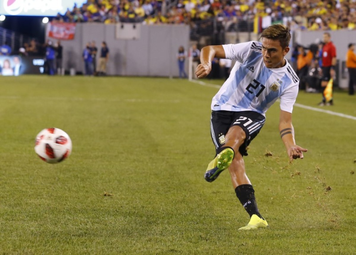 Sep 11, 2018; East Rutherford, NJ, USA; Argentina forward Paulo Dybala (21) takes a kick against Colombia during second half of an international friendly soccer match at MetLife Stadium. Mandatory Credit: Noah K. Murray-USA TODAY Sports