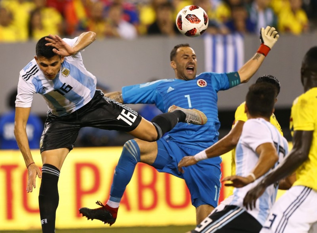 Sep 11, 2018; East Rutherford, NJ, USA; Colombia goalkeeper David Ospina (1) defends against Argentina defender Marcos Rojo (16) during second half of an international friendly soccer match at MetLife Stadium. Mandatory Credit: Noah K. Murray-USA TODAY Sports