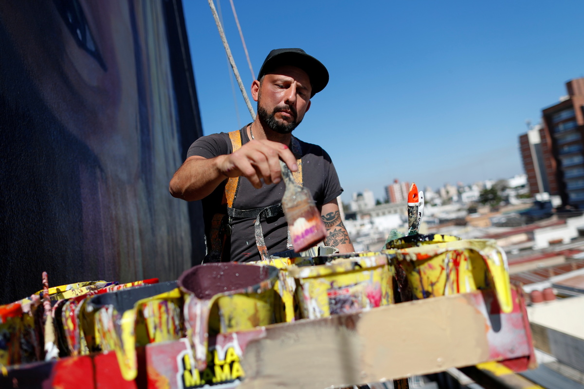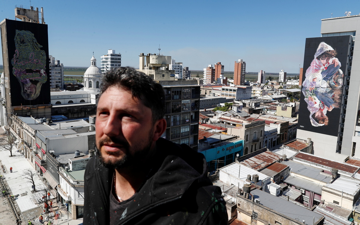 The two 40-meter-high (130-ft) paintings on the sides of buildings in the city center were spurred by the artist's desire to stir debate over the river's decline. Hit by a lack of rainfall upriver in Brazil, this year the Parana reached its lowest level in almost 80 years.
