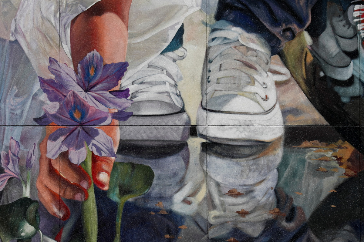 One mural shows a boy extracting a native flower from the river, while the other depicts a girl whose image is reflected in the water.