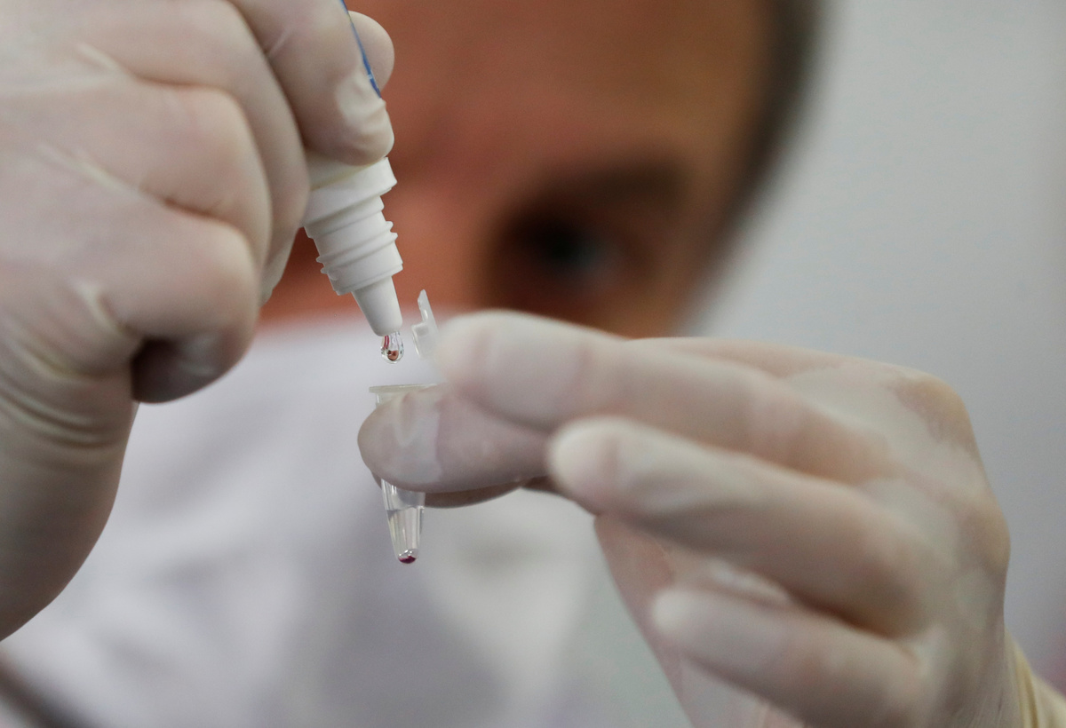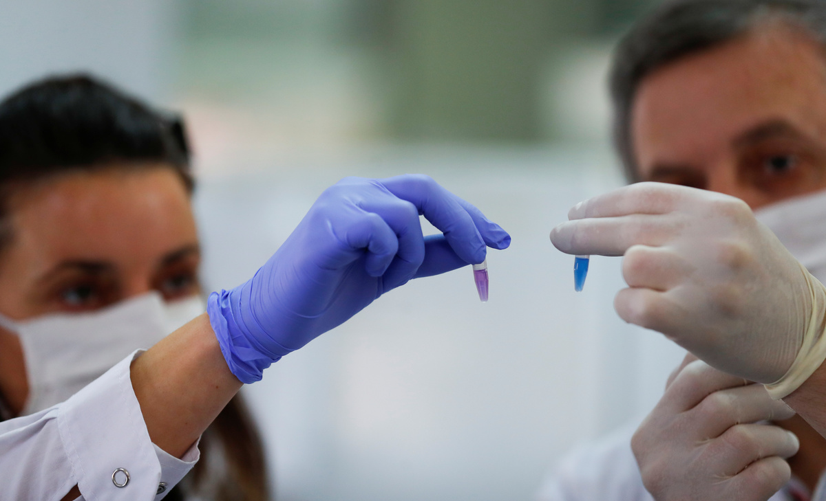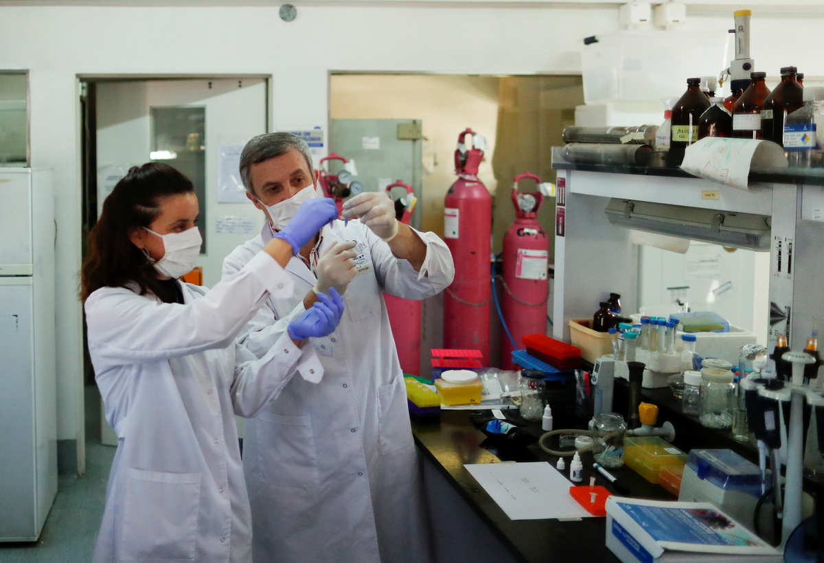 Santiago Webajh, scientist of the Pablo Cassara foundation, puts a drop of reagent in a container during a test of the new "NEOKIT-COVID-19?, developed by a group of Argentine scientists that diagnoses the coronavirus disease (COVID-19) in less than two hours, in Buenos Aires, Argentina May 19, 2020. REUTERS/Agustin Marcarian