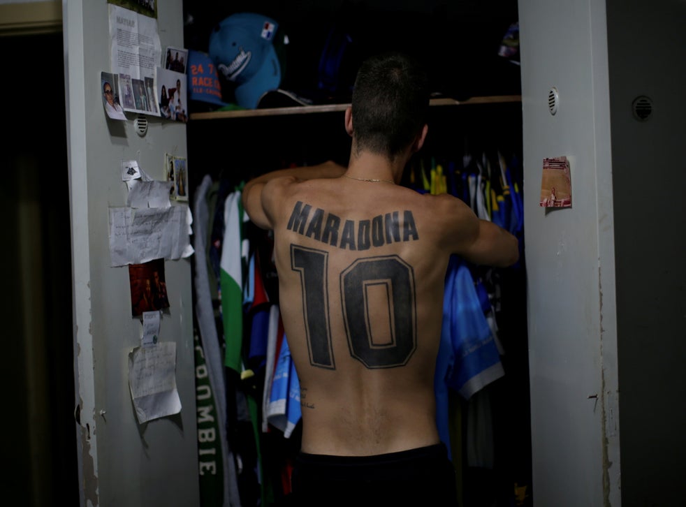 “In reality, I don't think about what people say, whether he's good or bad or whether he's an inspiration or not,” says Matias Disciosia, with a huge tattoo of Maradona's name and the number 10 on his back.