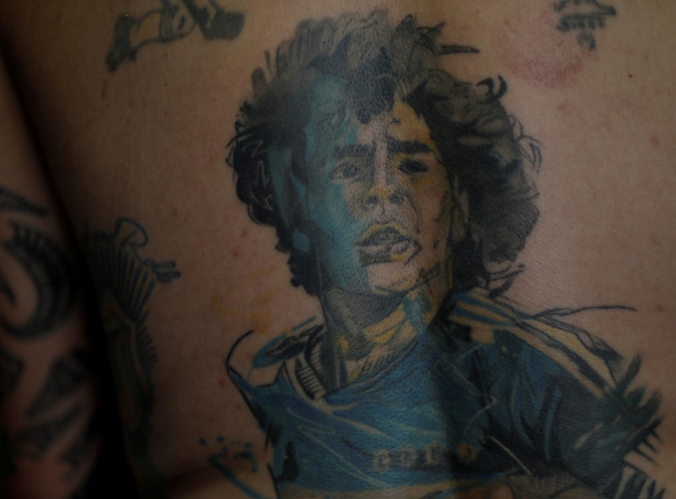 A few days after Maradona's death, fan Maximiliano Fernando is in a tattoo parlour in Buenos Aires and showing off tattoos of the player on his arm, including images of Maradona in mid-stride, and another where he is holding the World Cup aloft.