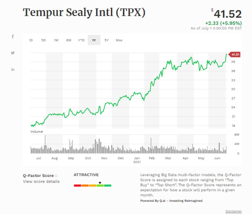Tempur Sealy Intl Inc is our final Top Buy of the day. The company manufactures mattresses and bedding products. Originally known as Tempur-Pedic, the name changed after it acquired its biggest competitor Sealy Corporation in 2012. Our AI systems rated Tempur Sealy C in Technicals, A in Growth, B in Low Volatility Momentum, and B in Quality Value. The stock closed up 5.95% to $41.52 on volume of 3,205,080 vs its 10-day price average of $38.49 and its 22-day price average of $38.52, and is up 56.92% for the year. Revenue grew by 6.02% in the last fiscal year and grew by 44.23% over the last three fiscal years, Operating Income grew by 14.64% in the last fiscal year and grew by 149.62% over the last three fiscal years, and EPS grew by 21.17% in the last fiscal year and grew by 332.72% over the last three fiscal years. Revenue was $3676.9M in the last fiscal year compared to $2702.9M three years ago, Operating Income was $520.4M in the last fiscal year compared to $239.0M three years ago, EPS was $1.64 in the last fiscal year compared to $0.46 three years ago, and ROE was 80.05% in the last year compared to 69.48% three years ago. Forward 12M Revenue is expected to grow by 1.98% over the next 12 months, and the stock is trading with a Forward 12M P/E of 14.7.