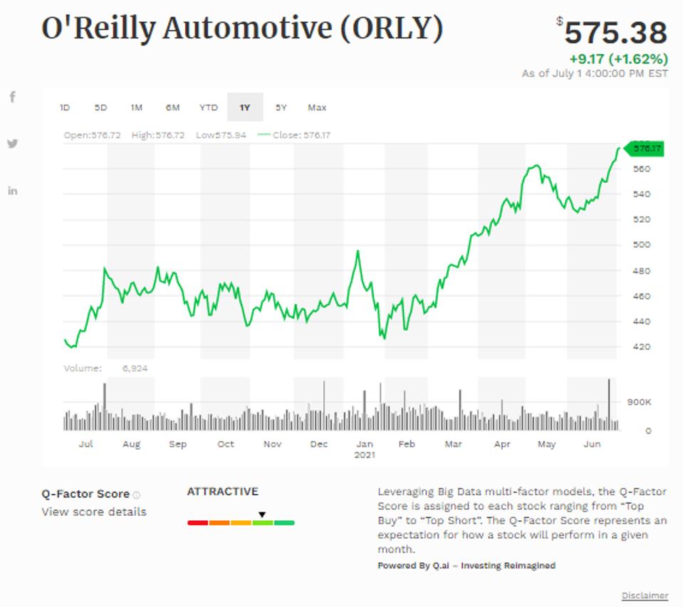 O’Reilly Automotive is our fourth Top Buy today. O’Reilly Automotive is a staple in the automotive parts industry, and serves both professional auto service providers and do-it-yourself customers. Our AI systems rated O’Reilly Automotive C in Technicals, D in Growth, A in Low Volatility Momentum, and B in Quality Value. The stock closed up 1.62% to $575.38 on volume of 351,484 vs its 10-day price average of $556.05 and its 22-day price average of $542.43, and is up 26.74% for the year. Revenue grew by 5.29% in the last fiscal year and grew by 28.13% over the last three fiscal years, Operating Income grew by 11.04% in the last fiscal year and grew by 47.28% over the last three fiscal years, and EPS grew by 13.24% in the last fiscal year and grew by 65.5% over the last three fiscal years. Revenue was $11604.49M in the last fiscal year compared to $9536.43M three years ago, Operating Income was $2422.74M in the last fiscal year compared to $1826.58M three years ago, EPS was $23.53 in the last fiscal year compared to $16.1 three years ago, and ROE was 651.9% in the last year compared to 263.13% three years ago. The stock is also trading with a Forward 12M P/E of 22.9.