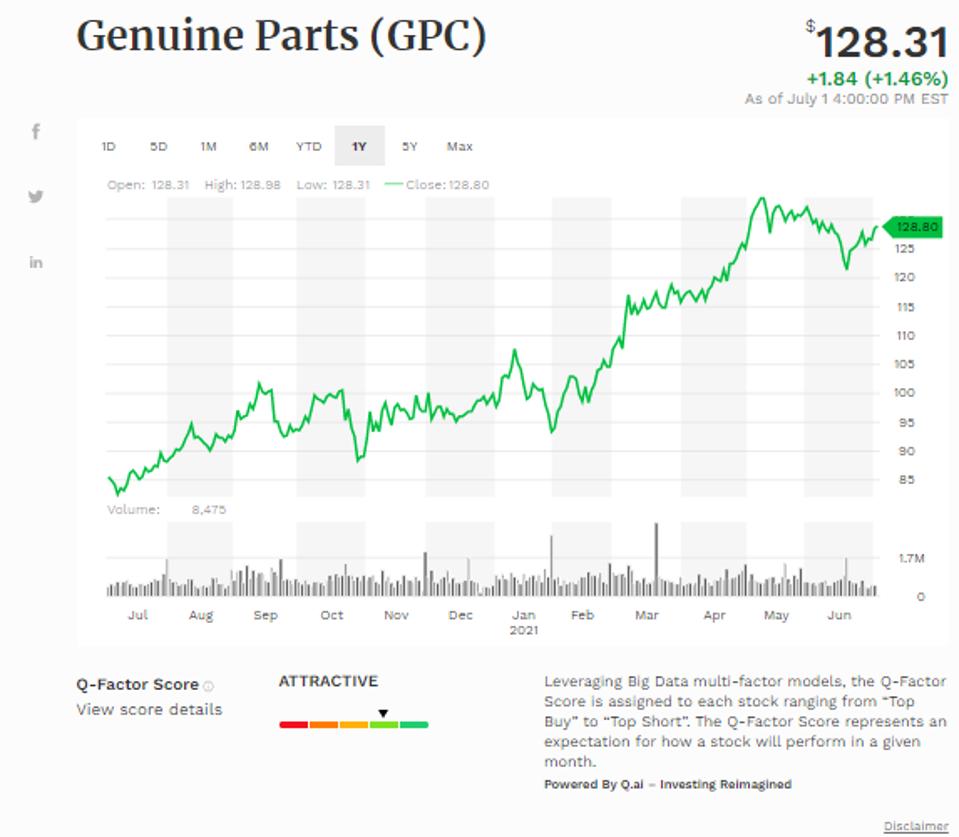 Genuine Parts Co is our next Top Buy. Genuine Parts Co engages in the distribution of automotive replacement parts, industrial replacement parts, office products and electrical/electronic materials. Our AI systems rated the company C in Technicals, C in Growth, A in Low Volatility Momentum, and C in Quality Value. The stock closed up 1.45% to $128.31 on volume of 506,314 vs its 10-day price average of $125.66 and its 22-day price average of $126.94, and is up 30.34% for the year. Revenue grew by 2.25% in the last fiscal year and grew by 0.46% over the last three fiscal years, Operating Income grew by 9.85% in the last fiscal year and grew by 3.69% over the last three fiscal years, and EPS grew by -285.68% in the last fiscal year. Revenue was $16537.43M in the last fiscal year compared to $16831.6M three years ago, Operating Income was $1001.76M in the last fiscal year compared to $1061.22M three years ago, EPS was $(0.2) in the last fiscal year compared to $5.5 three years ago, and ROE was 4.73% in the last year compared to 21.61% three years ago. Forward 12M Revenue is expected to grow by 0.77% over the next 12 months, and the stock is trading with a Forward 12M P/E of 21.34.