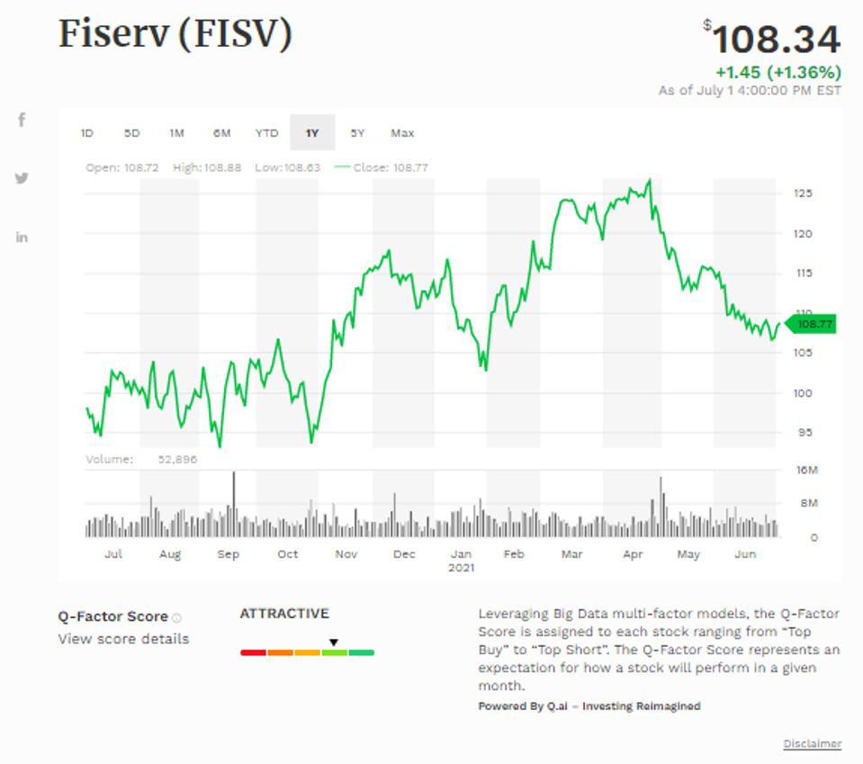 Fiserv Inc is our second Top Buy today. Fiserv is a FinTech company focused on financial services such as Payments, Financial, and Corporate and Other segments. Our AI systems rated the company C in Technicals, A in Growth, A in Low Volatility Momentum, and B in Quality Value. The stock closed up 1.36% to $108.34 on volume of 3,196,813 vs its 10-day price average of $107.92 and its 22-day price average of $109.4, and is down 3.2% for the year. Revenue grew by 154.82% over the last three fiscal years, while Operating Income grew by 17.36% in the last fiscal year and grew by 25.36% over the last three fiscal years. Revenue was $14852.0M in the last fiscal year compared to $5823.0M three years ago, Operating Income was $1630.0M in the last fiscal year compared to $1526.0M three years ago, EPS was $1.4 in the last fiscal year compared to $2.87 three years ago, and ROE was 2.86% in the last year compared to 47.25% three years ago. Forward 12M Revenue is expected to grow by 2.94% over the next 12 months, and the stock is trading with a Forward 12M P/E of 19.16.