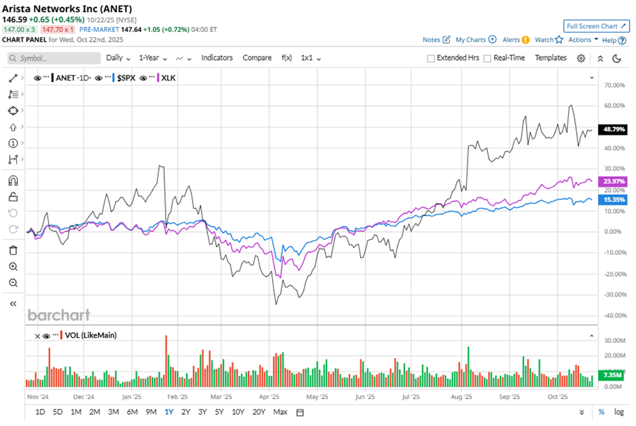 ANET stock has significantly outperformed the S&P 500 Index’s ($SPX) 14.5% gains over the past 52 weeks, with shares up 47.9% during this period. Similarly, it notably outperformed the Technology Select Sector SPDR Fund’s (XLK) 23.2% rise over the same time frame.