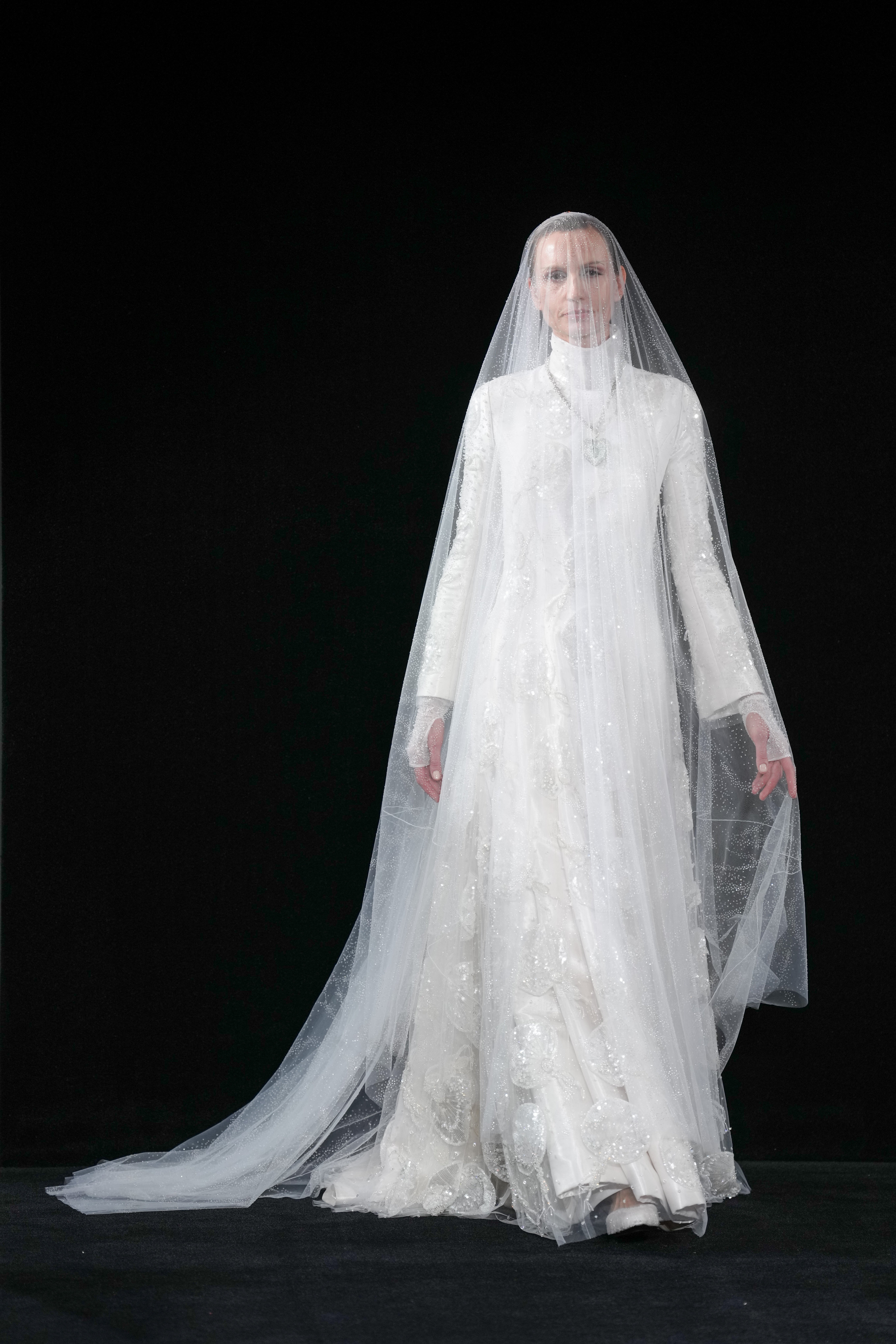 A sheer veil cascaded from the crown of her head, extending into a gentle train that seemed to dissolve into air. There was no corsetry or exposed skin, just precision, purity and poise.