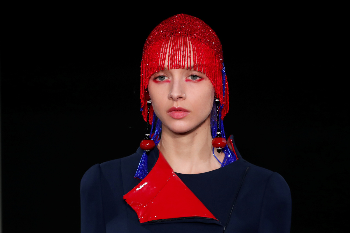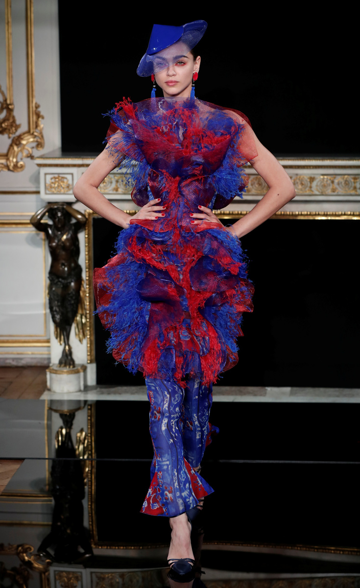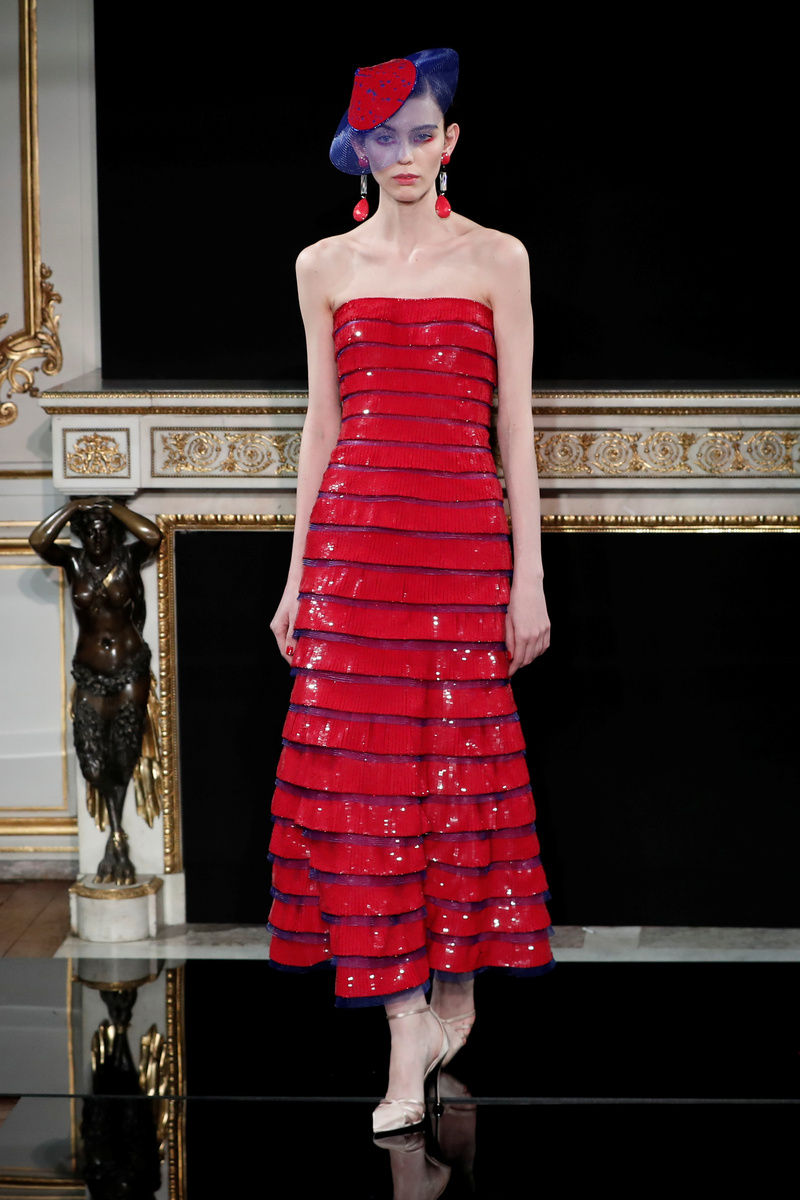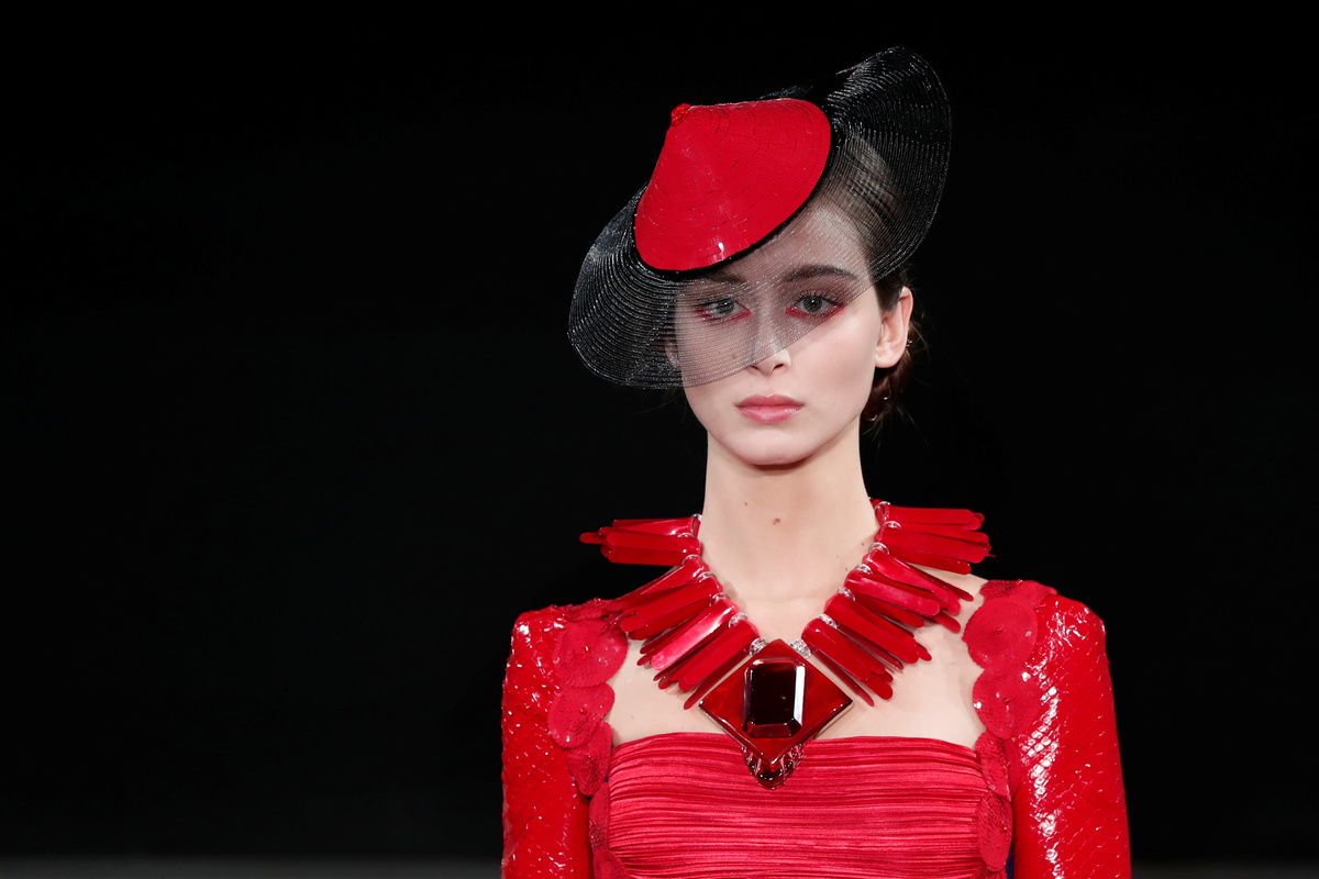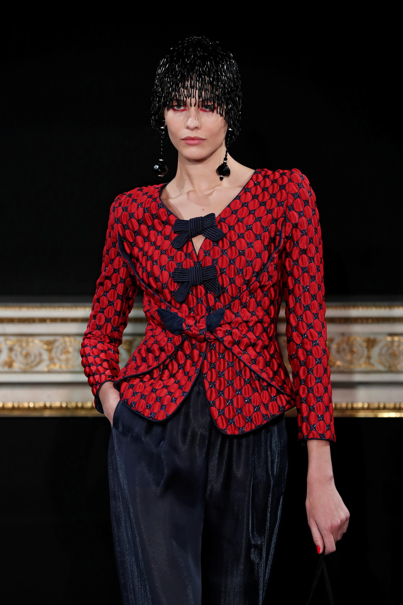 PARIS (Reuters) - Italy's Giorgio Armani played off bright reds against dazzling blue tones in his Haute Couture fashion collection in Paris on Tuesday, in an Art Deco-inspired feast of feathers, sequins, patent leather and crystals.
