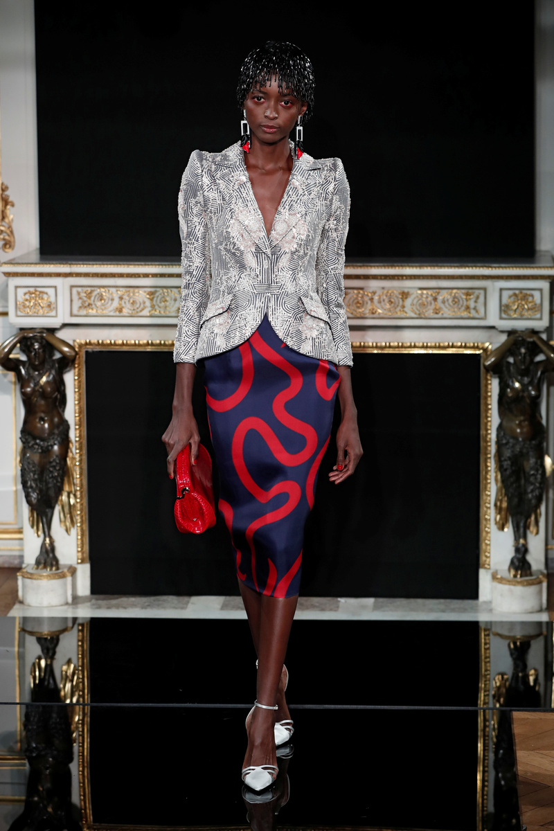 Clunky earrings and patterned gowns recalled the geometry of Art Deco architecture, and models walked to the sultry soundtrack of Bernardo Bertolucci's 1970 film The Conformist.
