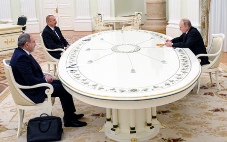 Russian President Vladimir Putin on Monday hosted his counterparts from Armenia and Azerbaijan, their first meeting since a Russia-brokered truce ended six weeks of fighting over Nagorno-Karabakh