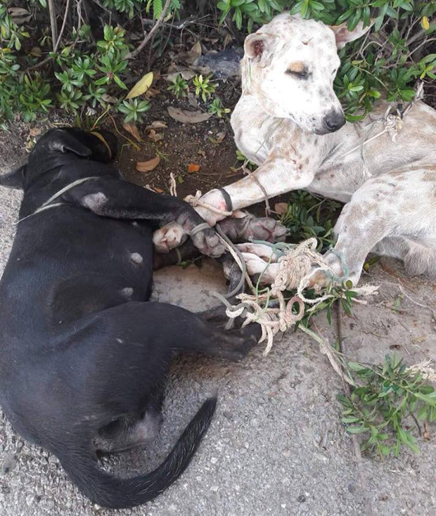 The Watchdog Thailand Facebook account on Thursday posted photos of two dogs that were tied together, dumped in a parking lot and left lying under the hot sun.