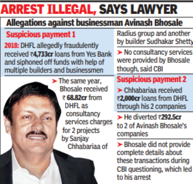 MUMBAI: The remand hearing of arrested Pune businessman Avinash Bhosale, in a rare development, was adjourned for three days after his lawyer said the arrest was “illegal” as the CBI court had not passed any order. Terming the circumstances “peculiar”, the court said Bhosale will be kept in the CBI’s BKC guesthouse till then.