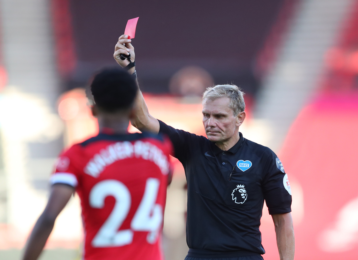 Soccer Football - Premier League - Southampton v Arsenal - St Mary's Stadium, Southampton, Britain - June 25, 2020 Referee Graham Scott shows a red card to Southampton's Jack Stephens, as play resumes behind closed doors following the outbreak of the coronavirus disease (COVID-19) Catherine Ivill/Pool via REUTERS