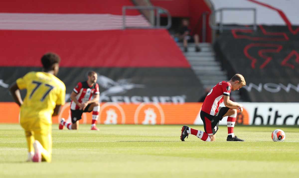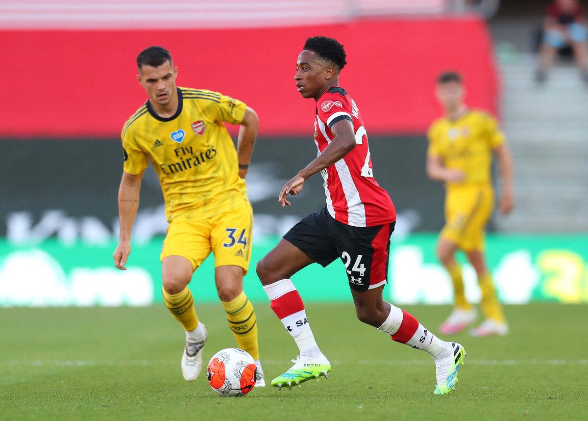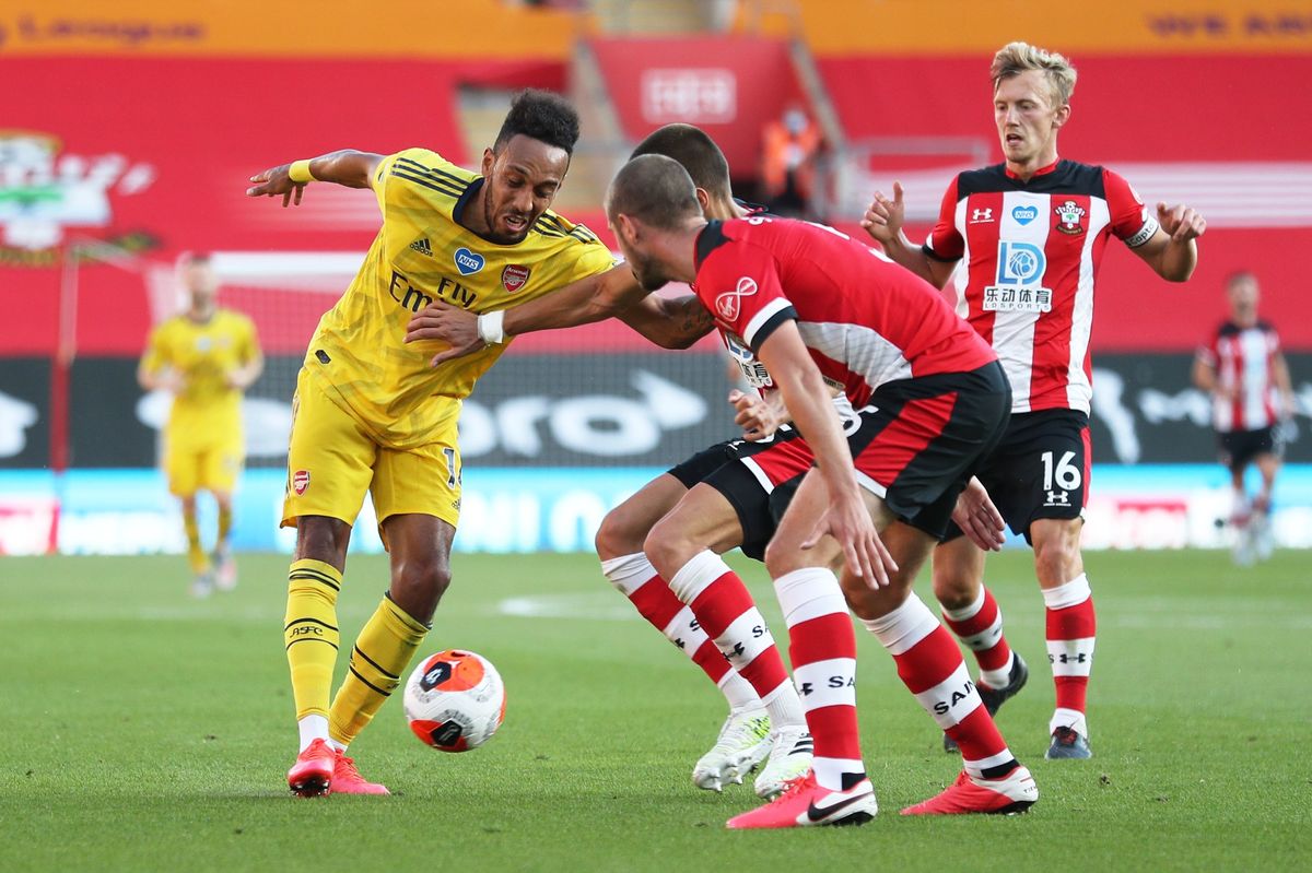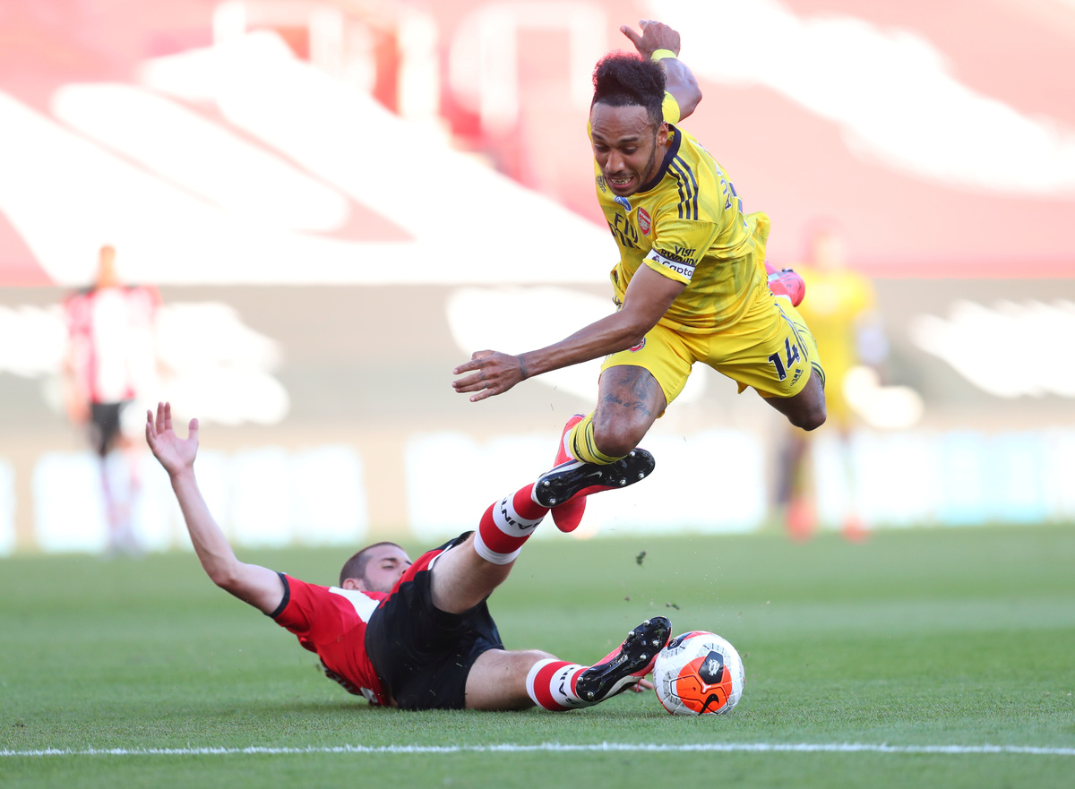 Soccer Football - Premier League - Southampton v Arsenal - St Mary's Stadium, Southampton, Britain - June 25, 2020 Southampton's Yan Valery in action with Arsenal's Bukayo Saka, as play resumes behind closed doors following the outbreak of the coronavirus disease (COVID-19) Andrew Matthews/Pool via REUTERS Soccer Football - Premier League - Southampton v Arsenal - St Mary's Stadium, Southampton, Britain - June 25, 2020 Southampton's Nathan Redmond in action with Arsenal's Bukayo Saka, as play resumes behind closed doors following the outbreak of the coronavirus disease (COVID-19) Catherine Ivill/Pool via REUTERS Soccer Football - Premier League - Southampton v Arsenal - St Mary's Stadium, Southampton, Britain - June 25, 2020 Arsenal's Pierre-Emerick Aubameyang in action, as play resumes behind closed doors following the outbreak of the coronavirus disease (COVID-19) Andrew Matthews/Pool via REUTERS Soccer Football - Premier League - Southampton v Arsenal - St Mary's Stadium, Southampton, Britain - June 25, 2020 Arsenal's Granit Xhaka in action with Southampton's Kyle Walker-Peters, as play resumes behind closed doors following the outbreak of the coronavirus disease (COVID-19) Catherine Ivill/Pool via REUTERS Soccer Football - Premier League - Southampton v Arsenal - St Mary's Stadium, Southampton, Britain - June 25, 2020 Southampton's James Ward-Prowse kneels in support of the Black Lives Matter campaign before the match, as play resumes behind closed doors following the outbreak of the coronavirus disease (COVID-19) Andrew Matthews/Pool via REUTERS