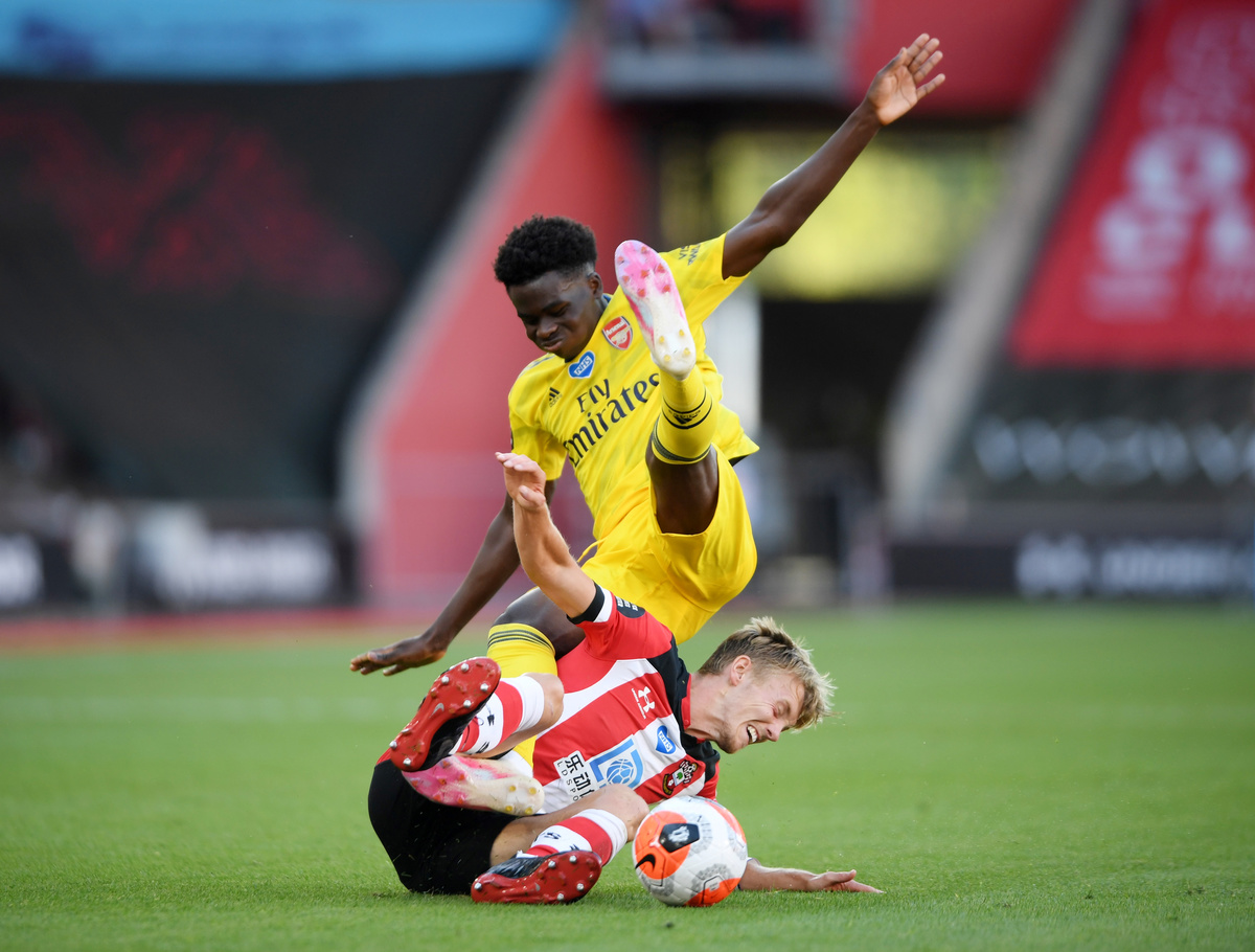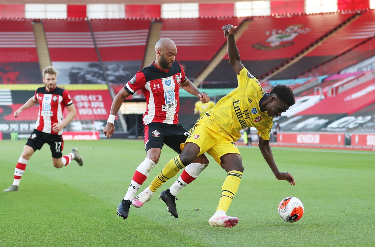 Soccer Football - Premier League - Southampton v Arsenal - St Mary's Stadium, Southampton, Britain - June 25, 2020 Arsenal's Bukayo Saka in action with Southampton's James Ward-Prowse, as play resumes behind closed doors following the outbreak of the coronavirus disease (COVID-19) Mike Hewitt/Pool via REUTERS