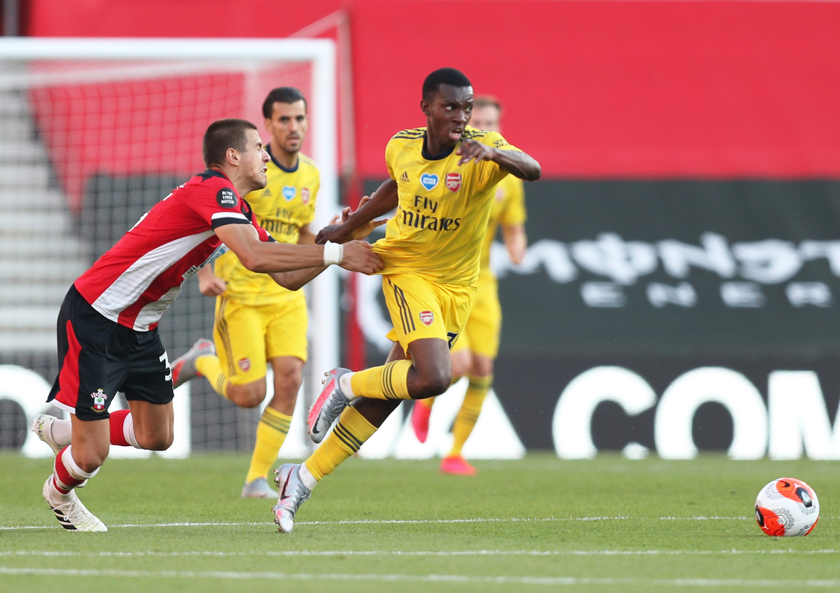 Soccer Football - Premier League - Southampton v Arsenal - St Mary's Stadium, Southampton, Britain - June 25, 2020 Southampton's Jan Bednarek in action with Arsenal's Eddie Nketiah, as play resumes behind closed doors following the outbreak of the coronavirus disease (COVID-19) Andrew Matthews/Pool via REUTERS