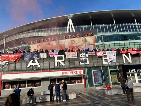 They also hung banners over the edge of the concourse including ones that read, “Arsenal till I die. Kroenke out,” and “Our club our home. Sell up Stan.”
