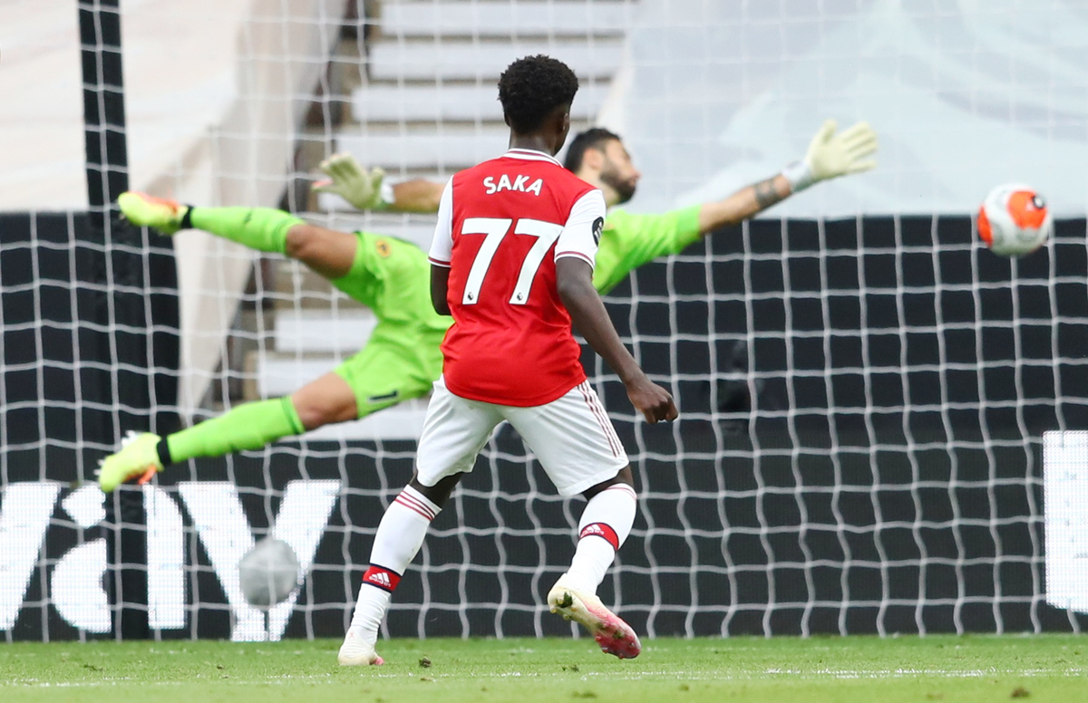 Arsenal put a dent in Wolverhampton Wanderers' hopes of a top-four finish as Bukayo Saka's first Premier League goal helped them to an impressive 2-0 away victory on Saturday.