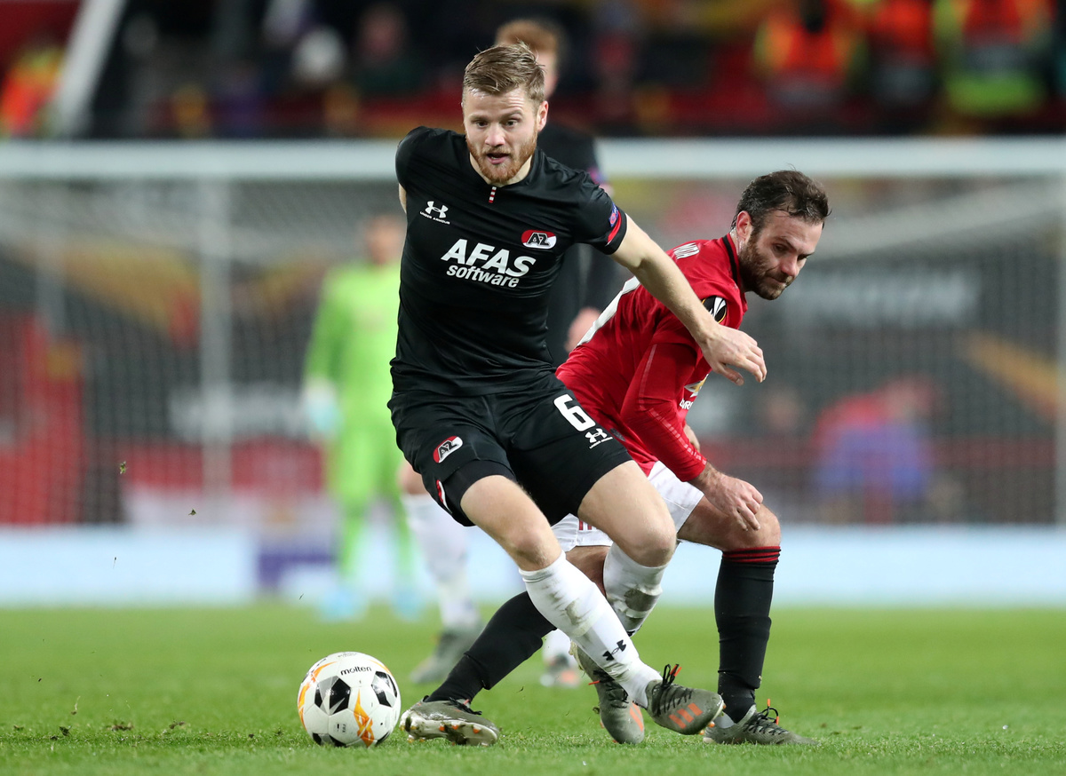 Soccer Football - Europa League - Group L - Manchester United v AZ Alkmaar - Old Trafford, Manchester, Britain - December 12, 2019 AZ Alkmaar's Fredrik Midtsjo in action with Manchester United's Juan Mata REUTERS/Jon Super