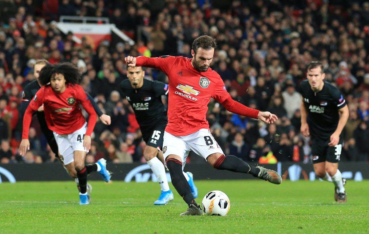 Soccer Football - Europa League - Group L - Manchester United v AZ Alkmaar - Old Trafford, Manchester, Britain - December 12, 2019 Manchester United's Juan Mata scores their third goal from the penalty spot REUTERS/Jon Super