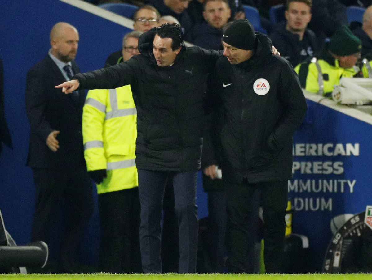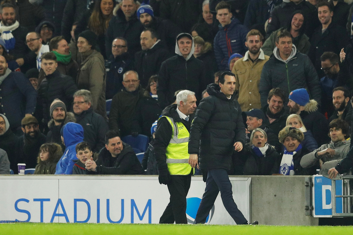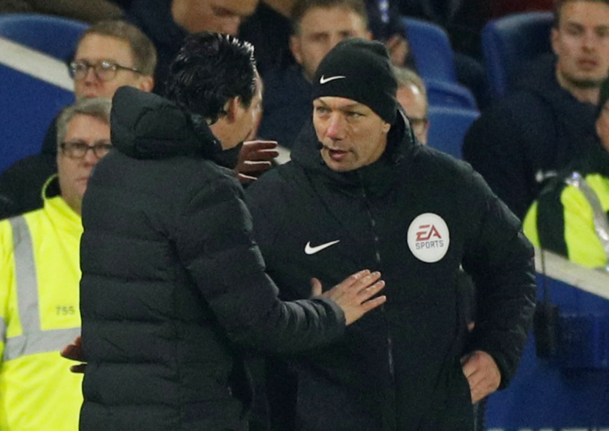 Soccer Football - Premier League - Brighton & Hove Albion v Arsenal - The American Express Community Stadium, Brighton, Britain - December 26, 2018 Arsenal manager Unai Emery with the fourth official after he kicked a bottle into the crowd Action Images via Reuters/John Sibley