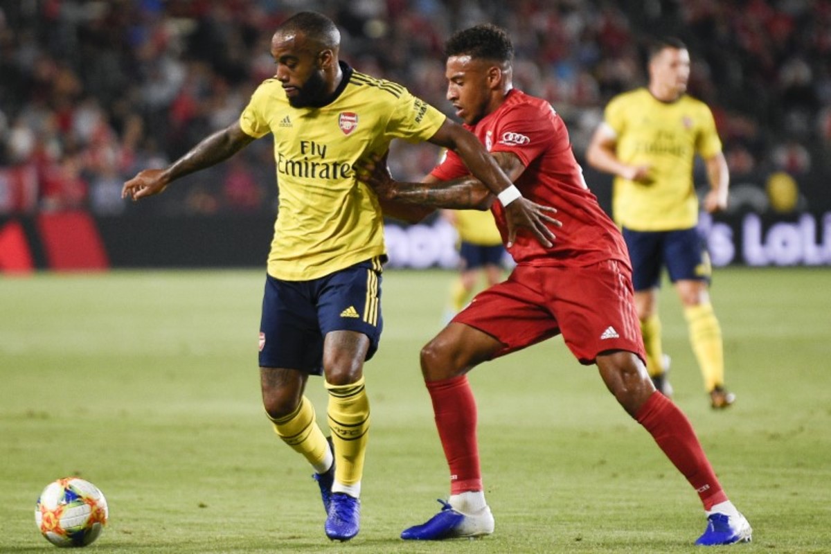 Jul 17, 2019; Carson, CA, USA; Arsenal forward Alexandre Lacazette (9) moves the ball while Bayern Munich defender Corentin Tolisso (24) defends during the first half of the International Champions Cup soccer series at Dignity Health Sports Park. Credit: Kelvin Kuo-USA TODAY Sports