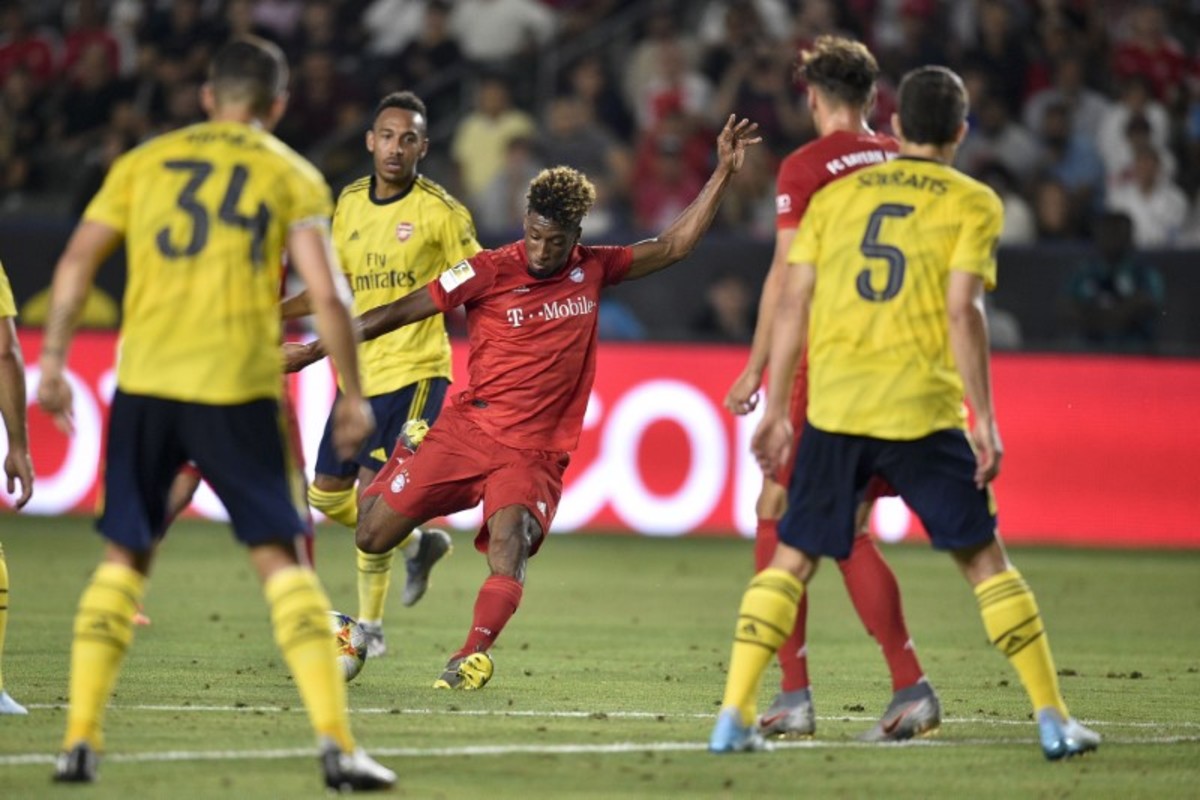 Jul 17, 2019; Carson, CA, USA; Bayern Munich midfielder Kingsley Coman (29) attempts a shot during the second half of the International Champions Cup soccer series against Arsenal at Dignity Health Sports Park. Credit: Kelvin Kuo-USA TODAY Sports