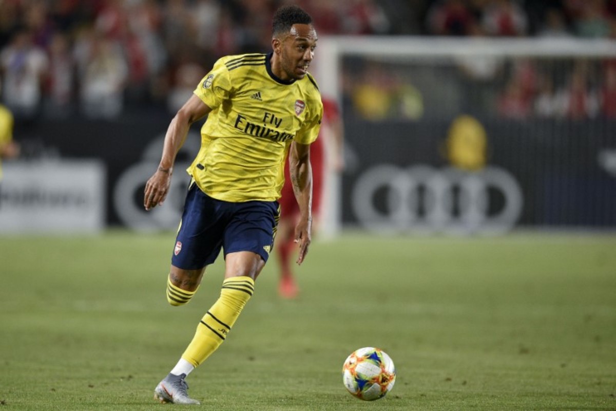 Jul 17, 2019; Carson, CA, USA; Arsenal forward Pierre-Emerick Aubameyang (14) moves the ball down the field during the first half of the International Champions Cup soccer series against Bayern Munich at Dignity Health Sports Park. Credit: Kelvin Kuo-USA TODAY Sports