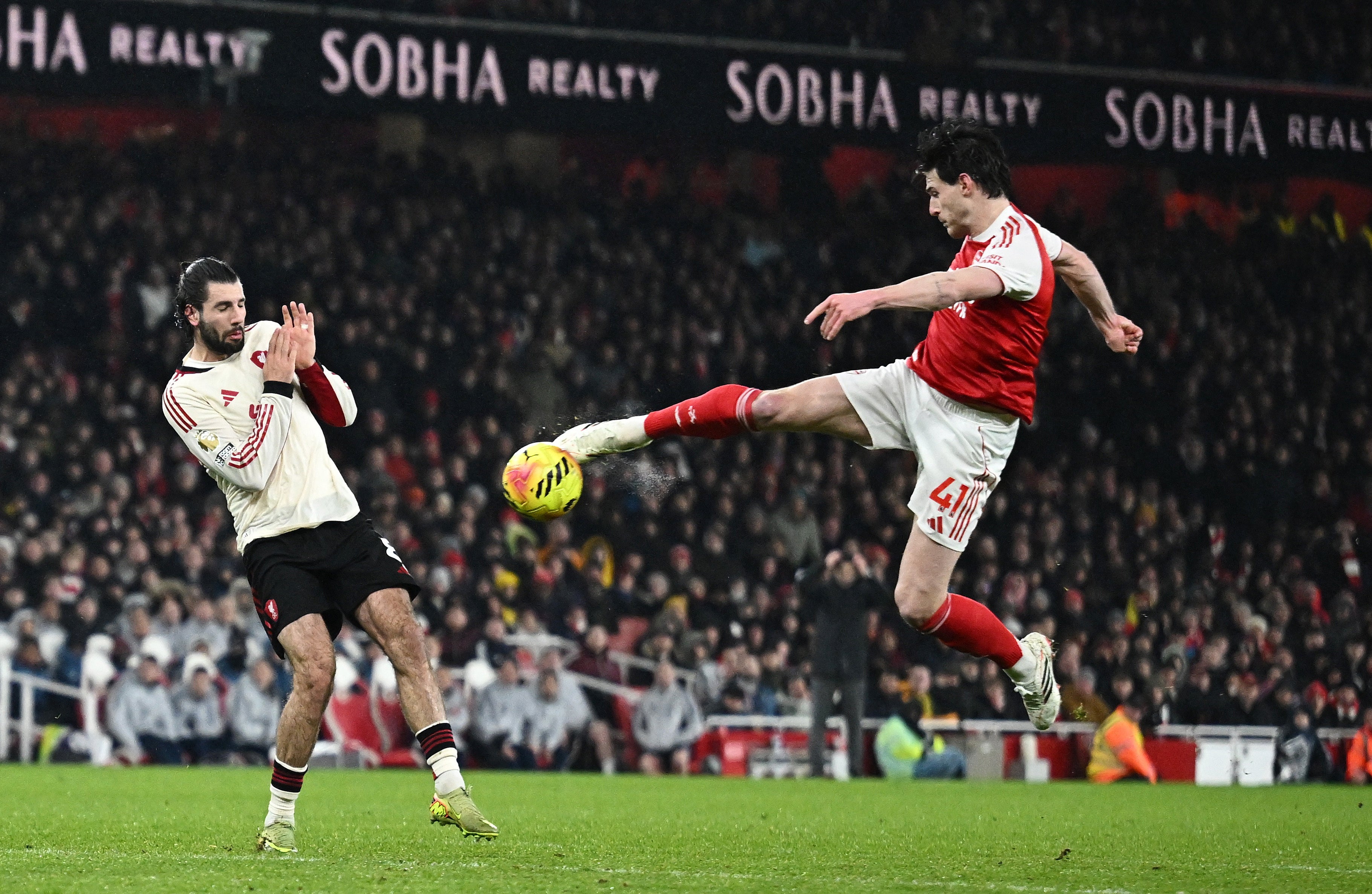 Lewis-Skelly does well to spin out of a tackle and poke the ball up to Martinelli.