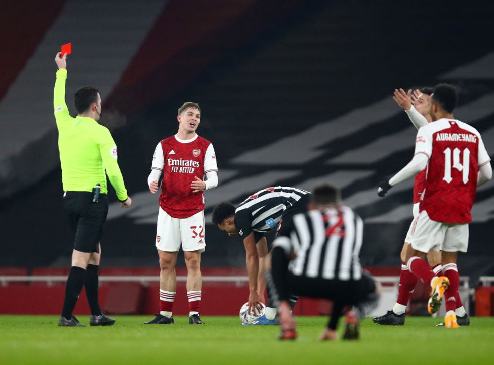 On a chilly afternoon that turned into a freezing night at the Emirates Stadium, it was Emile Smith Rowe who made the precious first breakthrough. But things could have been very different for the 21-year-old, who was shown a straight red card in the dying minutes of normal time for a challenge on Sean Longstaff. However, a reprieve was given by VAR, with referee Chris Kavanagh reversing his decision after consulting the pitchside monitor. Replays showed Smith Rowe took a bit more of the ball and a lot less of Longstaff’s shin than it first seemed.
