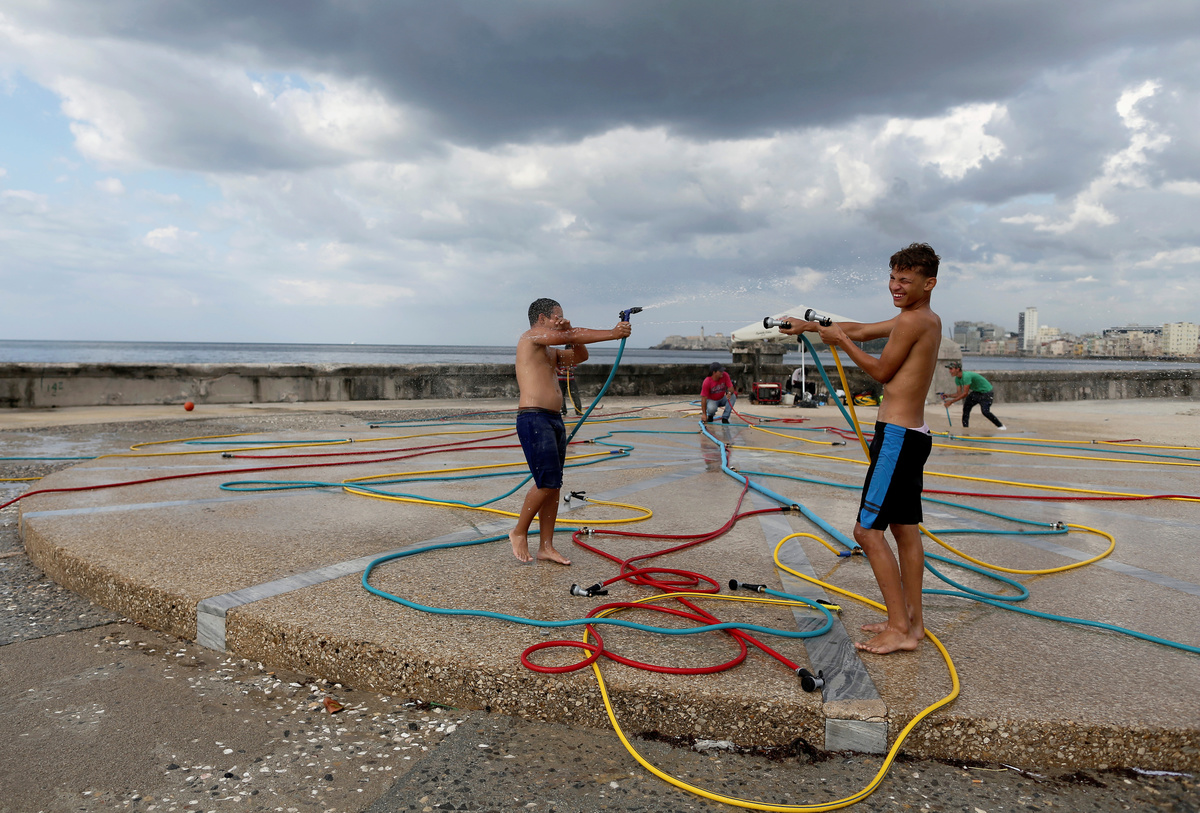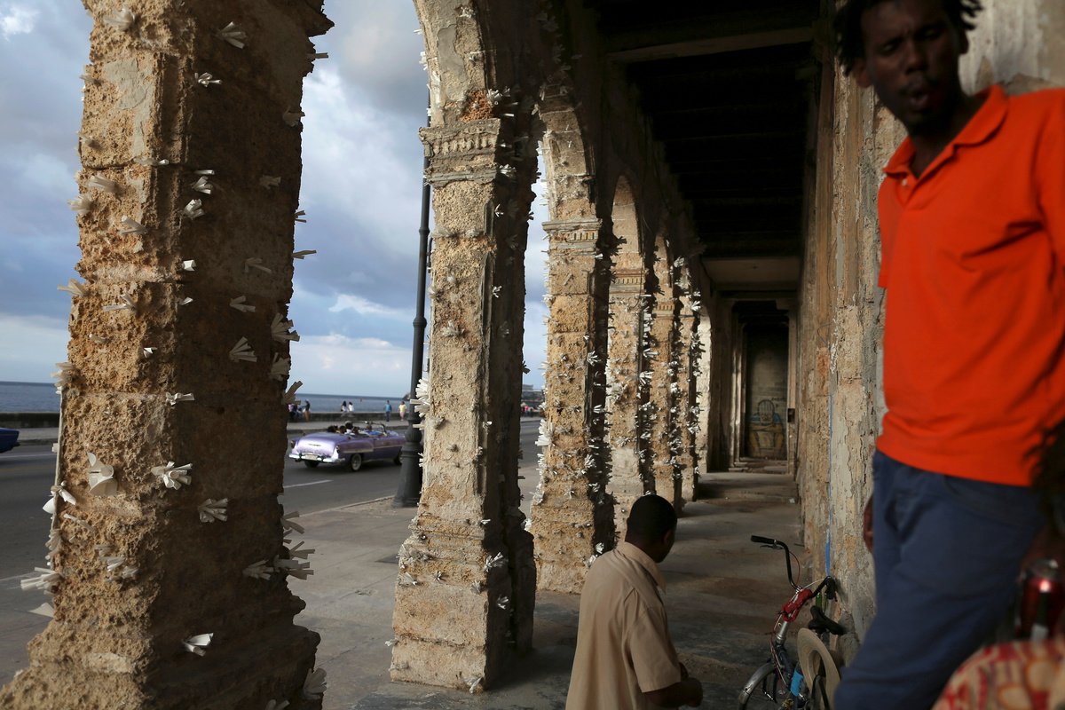 HAVANA (Reuters) - Cones of white paper sprout from the seasalt-eroded pillars of one colonial building along Havana's seafront, elaborately painted curtains cascade from another while out front children play with an installation of multicolored hoses.